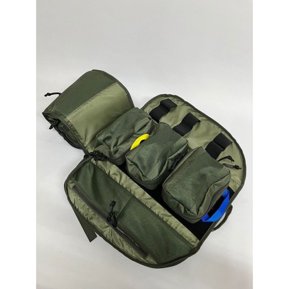 Рюкзак объёмом 27 литров оснащен одним основным отделением, которое раскрывается полностью, а также верхним, передним и боковыми карманами. В комплекте поставляются съемные подсумки/контейнеры, которые позволяют организовать медицинские принадлежности и инструменты внутри рюкзака.