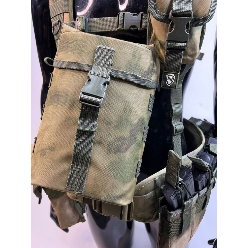 - Множество карманов: В нижней части системы расположены 5 карманов под магазины АК - три одиночных открытых и два сдвоенных закрытых (по два магазина в каждом). Также есть подсумки для гранат, рации, сброса рожков/магазинов, а также сухарный подсумок на спине.