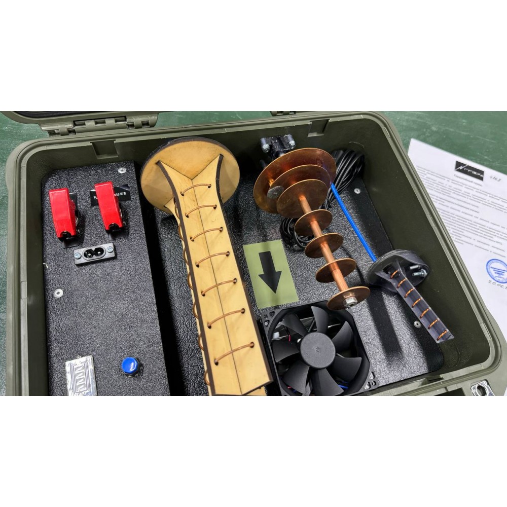 Для начала работы необходимо включить нужные диапазоны на панели управления, закрыть крышку кейса и разместить его на земле. После этого над местом установки формируется электромагнитный купол высотой до 1500 метров.